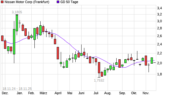 Mit dem Rücksetzer auf 2,01 EUR hat die Nissan Motor-Aktie am 17.11.2025 die 50-Tage-Linie nach unten gekreuzt.
