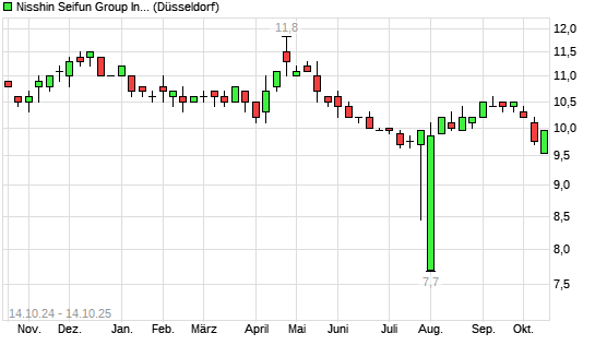 Mit dem Rücksetzer auf 9,70 EUR hat die Nisshin Seifun Group-Aktie (ISIN JP3676800000) am 13.10.2025 ein neues 10-Jahres-Tief erreicht und damit den Kurs vom 22.09.2022 eingestellt.