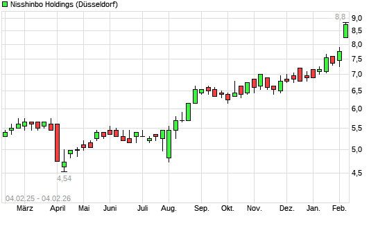 Mit dem Anstieg auf 8,60 EUR hat die Nisshinbo Holdings-Aktie (ISIN JP3678000005) am 03.02.2026 ein neues 5-Jahres-Hoch erreicht und damit den Kurs vom 02.02.2026 eingestellt.