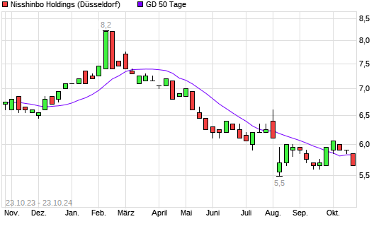 Mit dem Rücksetzer auf 5,80 EUR hat die Nisshinbo Holdings-Aktie am 22.10.2024 die 50-Tage-Linie nach unten gekreuzt.