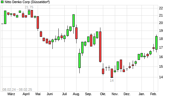 Mit dem Anstieg auf 18,30 EUR hat die Nitto Denko-Aktie (ISIN JP3684000007) am 07.02.2025 ein neues All-Time-High erreicht und damit den Kurs vom 06.02.2025 eingestellt.