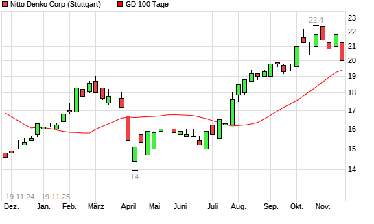Mit dem Rücksetzer auf 19,20 EUR hat die Nitto Denko-Aktie am 18.11.2025 die 100-Tage-Linie nach unten gekreuzt.