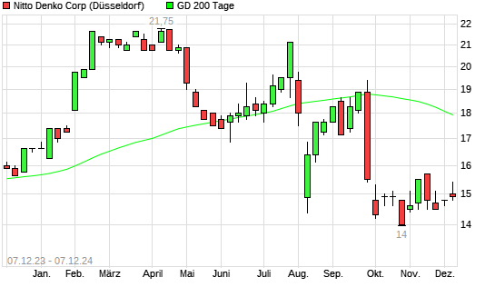 Mit dem Rücksetzer auf 15,20 EUR hat die Nitto Denko-Aktie am 06.12.2024 die 200-Tage-Linie nach unten gekreuzt.