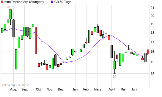 Mit dem Rücksetzer auf 15,80 EUR hat die Nitto Denko-Aktie am 02.07.2025 die 50-Tage-Linie nach unten gekreuzt.