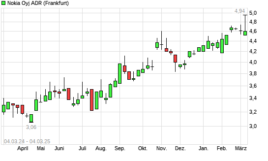 Mit dem Anstieg auf 4,86 EUR hat die Nokia ADR-Aktie (ISIN US6549022043) am 03.03.2025 ein neues 12-Monats-Hoch erreicht und damit den Kurs vom 24.02.2025 eingestellt.
