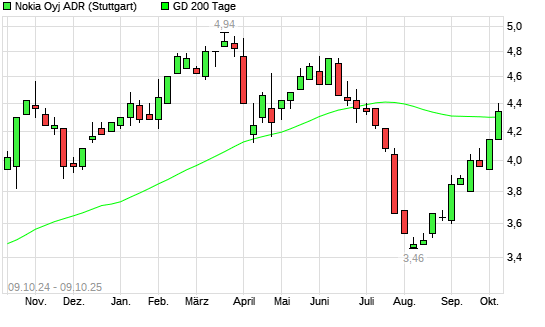 Mit dem Anstieg auf 4,38 EUR hat die Nokia ADR-Aktie am 08.10.2025 die 200-Tage-Linie nach oben gekreuzt.