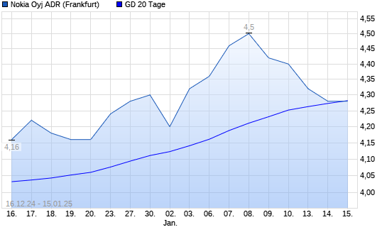 Mit dem Rücksetzer auf 4,28 EUR hat die Nokia ADR-Aktie am 14.01.2025 die 20-Tage-Linie nach unten gekreuzt.