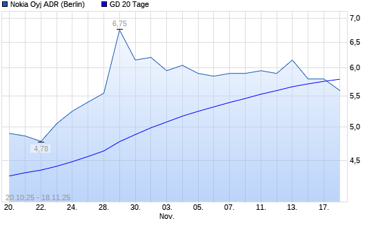 Mit dem Rücksetzer auf 5,60 EUR hat die Nokia ADR-Aktie am 17.11.2025 die 20-Tage-Linie nach unten gekreuzt.