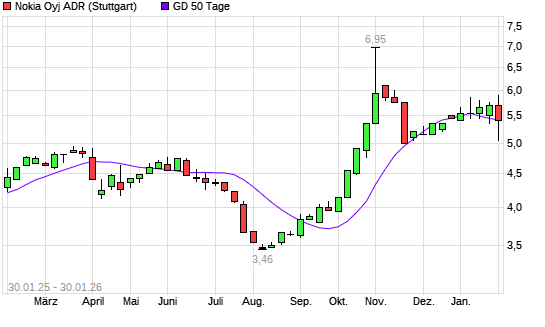 Mit dem Rücksetzer auf 5,40 EUR hat die Nokia ADR-Aktie am 29.01.2026 die 50-Tage-Linie nach unten gekreuzt.