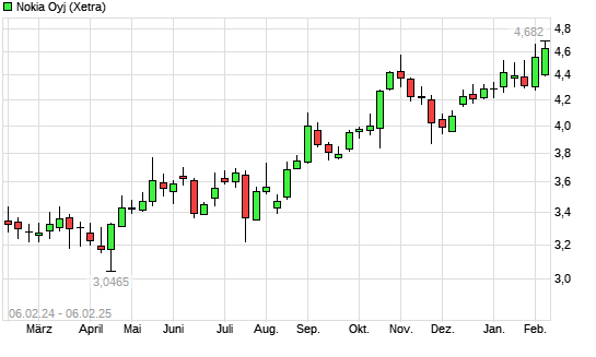 Mit dem Anstieg auf 4,61 EUR hat die Nokia-Aktie (ISIN FI0009000681) am 05.02.2025 ein neues 12-Monats-Hoch erreicht und damit den Kurs vom 30.01.2025 eingestellt.