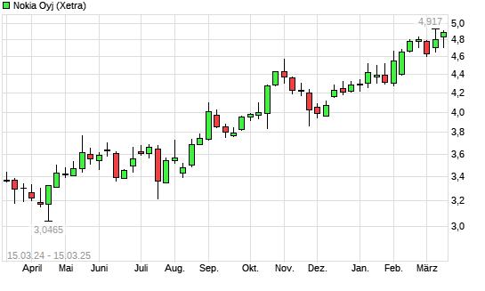 Mit dem Anstieg auf 4,89 EUR hat die Nokia-Aktie (ISIN FI0009000681) am 14.03.2025 ein neues 12-Monats-Hoch erreicht und damit den Kurs vom 03.03.2025 eingestellt.