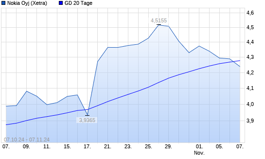 Mit dem Rücksetzer auf 4,25 EUR hat die Nokia-Aktie am 06.11.2024 die 20-Tage-Linie nach unten gekreuzt.