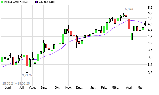 Mit dem Rücksetzer auf 4,59 EUR hat die Nokia-Aktie am 14.05.2025 die 50-Tage-Linie nach unten gekreuzt.