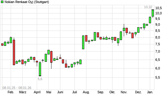 Mit dem Anstieg auf 10,20 EUR hat die Nokian Renkaat-Aktie (ISIN FI0009005318) am 07.01.2026 ein neues 12-Monats-Hoch erreicht und damit den Kurs vom 05.01.2026 eingestellt.