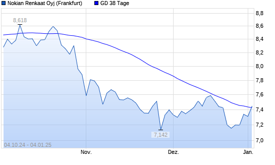 Mit dem Anstieg auf 7,44 EUR hat die Nokian Renkaat-Aktie am 03.01.2025 die 38-Tage-Linie nach oben gekreuzt.