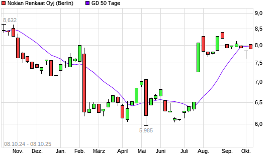 Mit dem Rücksetzer auf 7,87 EUR hat die Nokian Renkaat-Aktie am 07.10.2025 die 50-Tage-Linie nach unten gekreuzt.