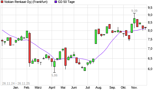 Mit dem Rücksetzer auf 8,07 EUR hat die Nokian Renkaat-Aktie am 25.11.2025 die 50-Tage-Linie nach unten gekreuzt.