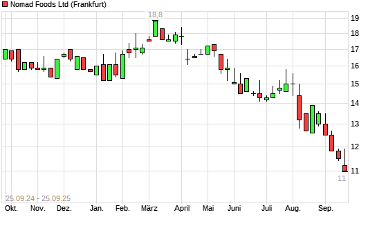 Mit dem Rücksetzer auf 11,00 EUR hat die Nomad Foods-Aktie (ISIN VGG6564A1057) am 24.09.2025 ein neues 5-Jahres-Tief erreicht und damit den Kurs vom 23.09.2025 eingestellt.