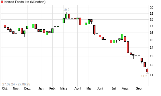 Mit dem Rücksetzer auf 10,80 EUR hat die Nomad Foods-Aktie (ISIN VGG6564A1057) am 26.09.2025 ein neues 5-Jahres-Tief erreicht und damit den Kurs vom 25.09.2025 eingestellt.