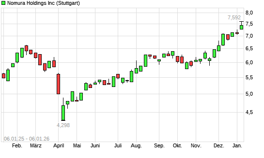 Mit dem Anstieg auf 7,32 EUR hat die Nomura-Aktie (ISIN JP3762600009) am 05.01.2026 ein neues 10-Jahres-Hoch erreicht und damit den Kurs vom 29.12.2025 eingestellt.