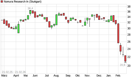 Mit dem Rücksetzer auf 20,80 EUR hat die Nomura-Aktie (ISIN JP3762800005) am 20.02.2026 ein neues 12-Monats-Tief erreicht und damit den Kurs vom 18.02.2026 eingestellt.
