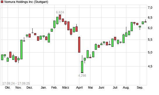 Mit dem Anstieg auf 6,26 EUR hat die Nomura-Aktie (ISIN JP3762600009) am 16.09.2025 ein neues 6-Monats-Hoch erreicht und damit den Kurs vom 11.09.2025 eingestellt.