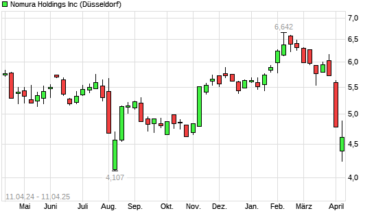 Mit dem Rücksetzer auf 4,35 EUR hat die Nomura-Aktie (ISIN JP3762600009) am 10.04.2025 ein neues 6-Monats-Tief erreicht und damit den Kurs vom 07.04.2025 eingestellt.