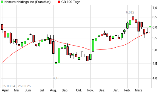 Mit dem Anstieg auf 6,01 EUR hat die Nomura-Aktie am 24.03.2025 die 100-Tage-Linie nach oben gekreuzt.