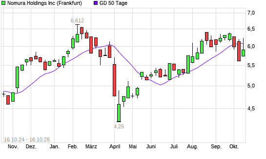 Mit dem Anstieg auf 6,10 EUR hat die Nomura-Aktie am 15.10.2025 die 50-Tage-Linie nach oben gekreuzt.