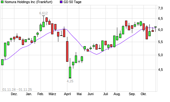 Mit dem Anstieg auf 6,13 EUR hat die Nomura-Aktie am 31.10.2025 die 50-Tage-Linie nach oben gekreuzt.