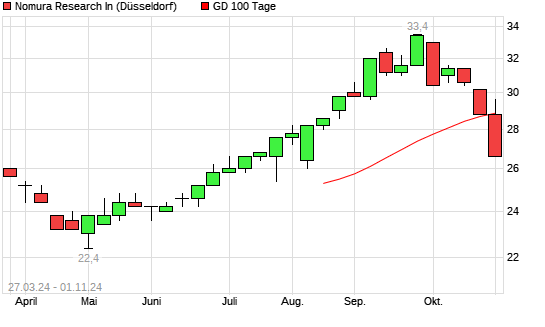Mit dem Rücksetzer auf 27,40 EUR hat die Nomura-Aktie am 31.10.2024 die 100-Tage-Linie nach unten gekreuzt.