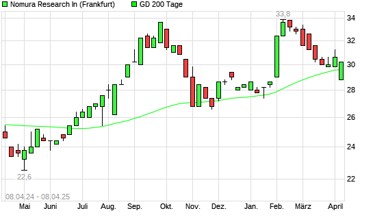 Mit dem Rücksetzer auf 28,80 EUR hat die Nomura-Aktie am 07.04.2025 die 200-Tage-Linie nach unten gekreuzt.