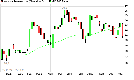 Mit dem Rücksetzer auf 30,60 EUR hat die Nomura-Aktie am 04.11.2025 die 200-Tage-Linie nach unten gekreuzt.