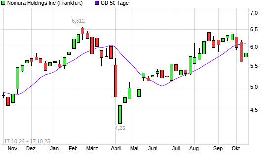 Mit dem Rücksetzer auf 5,91 EUR hat die Nomura-Aktie am 16.10.2025 die 50-Tage-Linie nach unten gekreuzt.