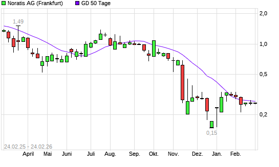 Mit dem Rücksetzer auf 0,26 EUR hat die Noratis-Aktie am 23.02.2026 die 50-Tage-Linie nach unten gekreuzt.