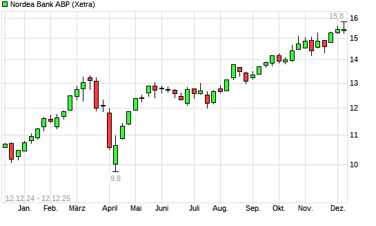 Mit dem Anstieg auf 15,75 EUR hat die Nordea Bank Abp-Aktie (ISIN FI4000297767) am 11.12.2025 ein neues All-Time-High erreicht und damit den Kurs vom 10.12.2025 eingestellt.