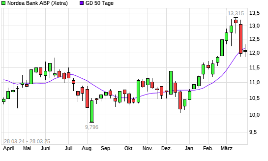 Mit dem Rücksetzer auf 12,14 EUR hat die Nordea Bank Abp-Aktie am 27.03.2025 die 50-Tage-Linie nach unten gekreuzt.