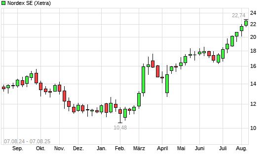 Mit dem Anstieg auf 22,50 EUR hat die Nordex-Aktie (ISIN DE000A0D6554) am 06.08.2025 ein neues 3-Jahres-Hoch erreicht und damit den Kurs vom 05.08.2025 eingestellt.