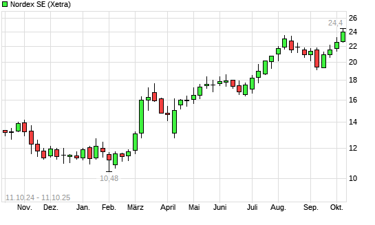 Mit dem Anstieg auf 23,98 EUR hat die Nordex-Aktie (ISIN DE000A0D6554) am 10.10.2025 ein neues 3-Jahres-Hoch erreicht und damit den Kurs vom 09.10.2025 eingestellt.