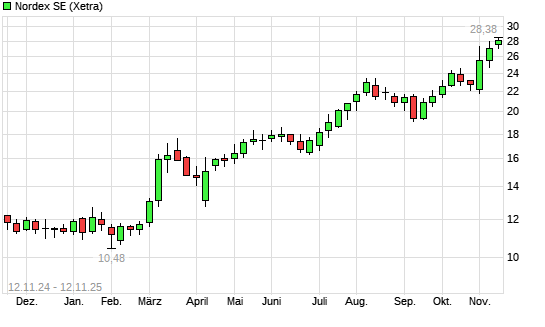 Mit dem Anstieg auf 27,88 EUR hat die Nordex-Aktie (ISIN DE000A0D6554) am 11.11.2025 ein neues 3-Jahres-Hoch erreicht und damit den Kurs vom 06.11.2025 eingestellt.