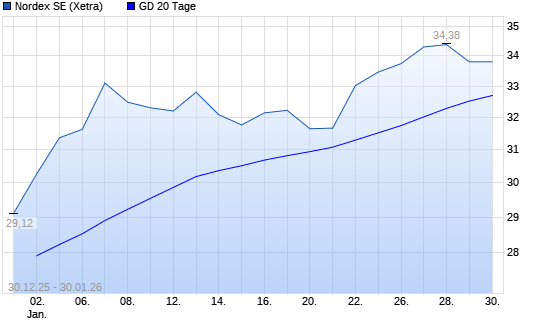 Mit dem Rücksetzer auf 32,08 EUR hat die Nordex-Aktie am 29.01.2026 die 20-Tage-Linie nach unten gekreuzt.