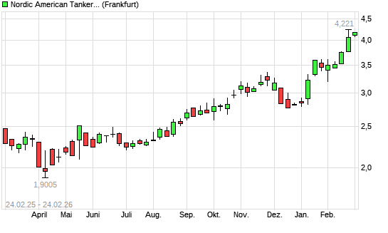 Mit dem Anstieg auf 4,08 EUR hat die Nordic American Tankers-Aktie (ISIN BMG657731060) am 23.02.2026 ein neues 12-Monats-Hoch erreicht und damit den Kurs vom 20.02.2026 eingestellt.
