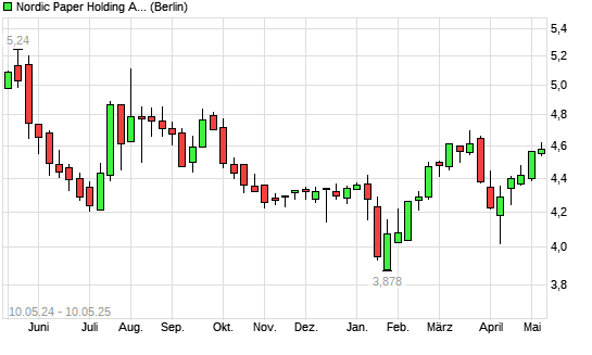 Mit dem Anstieg auf 4,59 EUR hat die Nordic Paper-Aktie (ISIN SE0014808838) am 09.05.2025 ein neues 6-Monats-Hoch erreicht und damit den Kurs vom 10.03.2025 eingestellt.