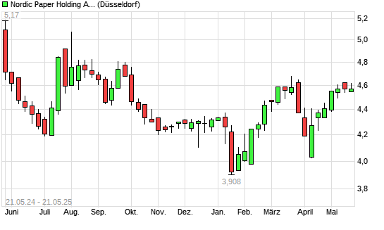 Mit dem Anstieg auf 4,62 EUR hat die Nordic Paper-Aktie (ISIN SE0014808838) am 20.05.2025 ein neues 6-Monats-Hoch erreicht und damit den Kurs vom 09.05.2025 eingestellt.