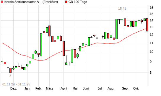 Mit dem Rücksetzer auf 12,68 EUR hat die Nordic Semiconductor-Aktie am 31.10.2025 die 100-Tage-Linie nach unten gekreuzt.