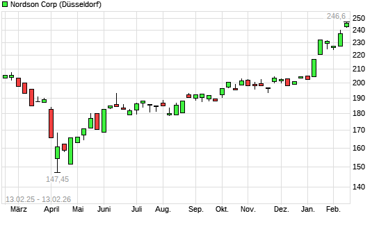 Mit dem Anstieg auf 247,20 EUR hat die Nordson-Aktie (ISIN US6556631025) am 12.02.2026 ein neues 12-Monats-Hoch erreicht und damit den Kurs vom 11.02.2026 eingestellt.