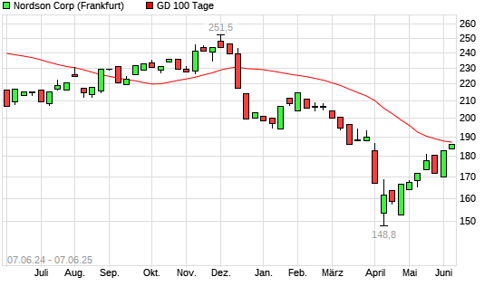 Mit dem Anstieg auf 185,90 EUR hat die Nordson-Aktie am 06.06.2025 die 100-Tage-Linie nach oben gekreuzt.