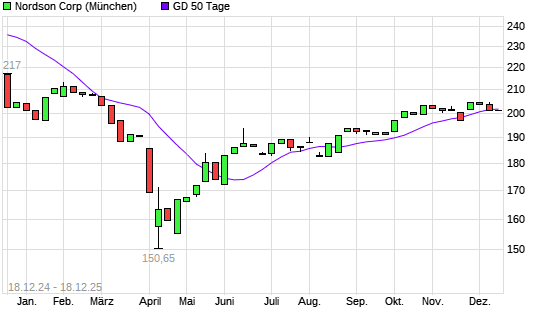 Mit dem Rücksetzer auf 199,80 EUR hat die Nordson-Aktie am 17.12.2025 die 50-Tage-Linie nach unten gekreuzt.