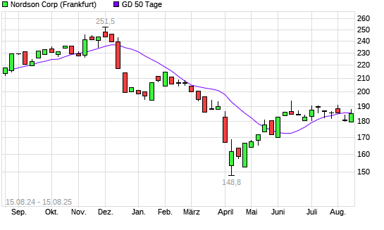 Mit dem Anstieg auf 187,75 EUR hat die Nordson-Aktie am 14.08.2025 die 50-Tage-Linie nach oben gekreuzt.Die Nordson-Aktie befindet sich seit dem 12.12.2024 im langfristigen Abwärtstrend und ...weiterlesen
