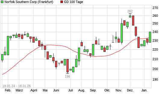 Mit dem Anstieg auf 240,00 EUR hat die Norfolk Southern-Aktie am 17.01.2025 die 100-Tage-Linie nach oben gekreuzt.
